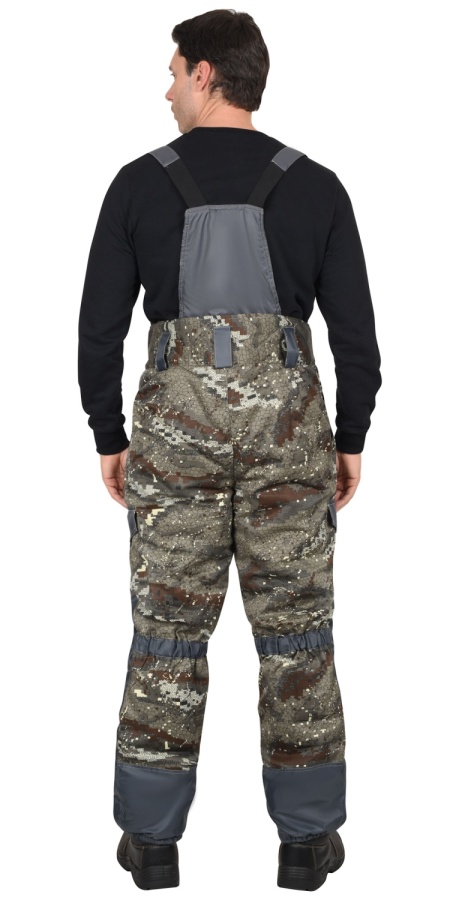 Брюки с центральной застежкой гульфика на три петли и пуговицы, с притачным поясом застежкой на две петли и две пуговицы, с пятью широкими шлевками, со спинкой и бретелями, с боковыми карманами с наклонным входом, с накладными карманами на боковых швах с фигурными клапанами застегивающиеся на канадскую пуговицу, с накладками передних половинок и накладками низа задних половинок.