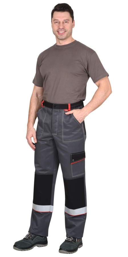 Брюки с застежкой гульфика на пуговицы. Передние половинки с боковыми карманами и наколенниками. На левом боковом шве передних половинок накладной карман с клапаном. Клапан застегивается на липучку и кнопку. Задние половинки с накладными карманами и карманами для инструментов. Притачной пояс брюк с резинкой по боковым сторонам для мягкого прилегания.