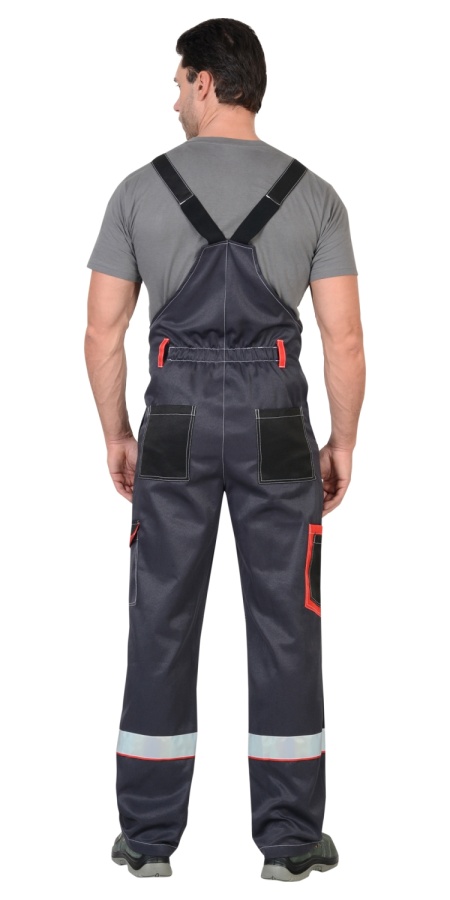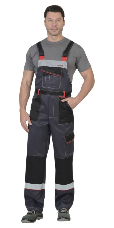 Полукомбинезон с застежкой на пуговицы: гульфик и левая боковая застежка. На грудке комбинированный карман с клапаном, застегивается на липучку и кнопку. Передние половинки с боковыми карманами и наколенниками. На левом боковом шве передних половинок накладной карман с клапаном, застегивается на липучку и кнопку. Задние половинки с накладными карманами и карманами для инструментов. По спинке резинка для лучшего прилегания. Полукомбинезон с бретелями, длина регулируется резинкой и застежкой-фастексом.