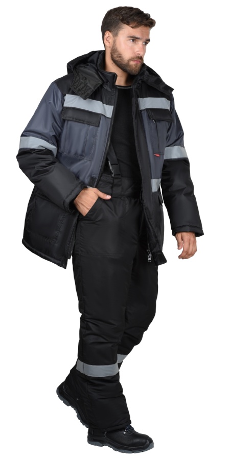 Куртка прямого силуэта на утепленной подкладке, удлиненная, с центральной застежкой на молнию до верха воротника, накрытую ветрозащитным клапаном от горловины до низа куртки, застегивается на потайные липучки. Куртка с воротником стойка, с верхними и нижними накладными карманами с клапанами, с втачными рукавами с внутренними трикотажными манжетами. Под клапаном левого нагрудного кармана расположена петля с полукольцом для крепления бейджа. Куртка со съемным капюшоном, который пристегивается к горловине куртки при помощи молнии.
