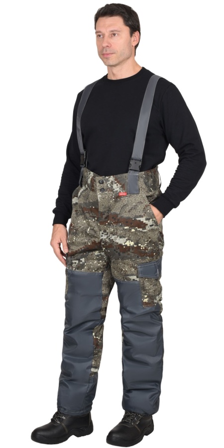 Брюки с центральной застежкой гульфика на три петли и пуговицы, с притачным поясом застежкой на две петли и две пуговицы, с пятью широкими шлевками, со спинкой и бретелями, с боковыми карманами с наклонным входом, с накладными карманами на боковых швах с фигурными клапанами застегивающиеся на канадскую пуговицу, с накладками передних половинок и накладками низа задних половинок.