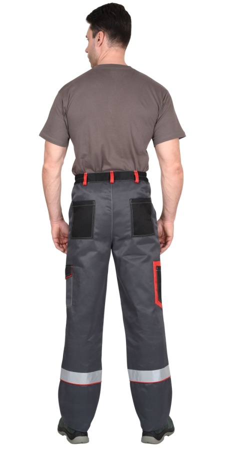 Брюки с застежкой гульфика на пуговицы. Передние половинки с боковыми карманами и наколенниками. На левом боковом шве передних половинок накладной карман с клапаном. Клапан застегивается на липучку и кнопку. Задние половинки с накладными карманами и карманами для инструментов. Притачной пояс брюк с резинкой по боковым сторонам для мягкого прилегания.